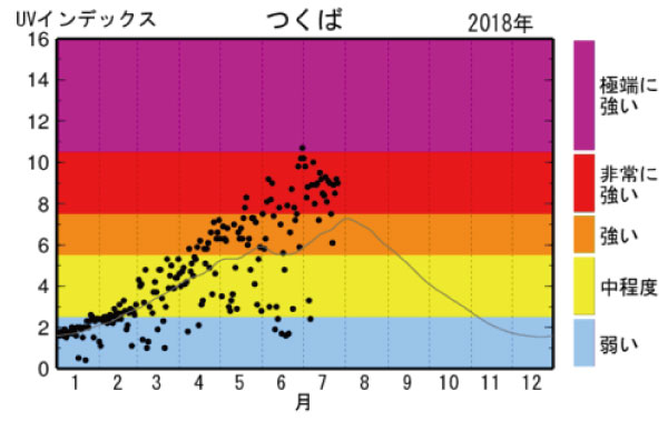 (日最大の紫外線の年間推移:つくばの観測地においてのデータ)